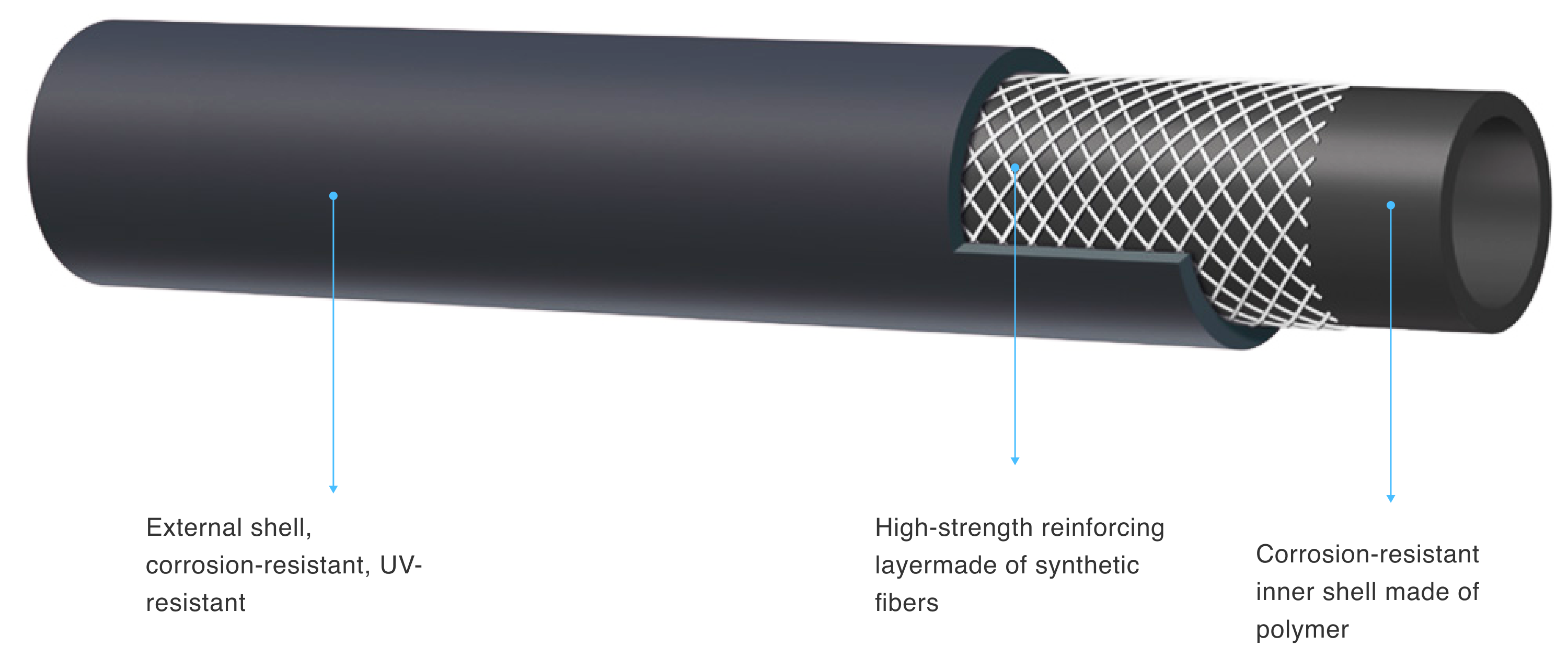 Individual sections of the pipeline are connected by means of metal fittings of various designs. Manufactured pipes comply with API 15S “Spooled reinforced plastic pipe for pipelines”.