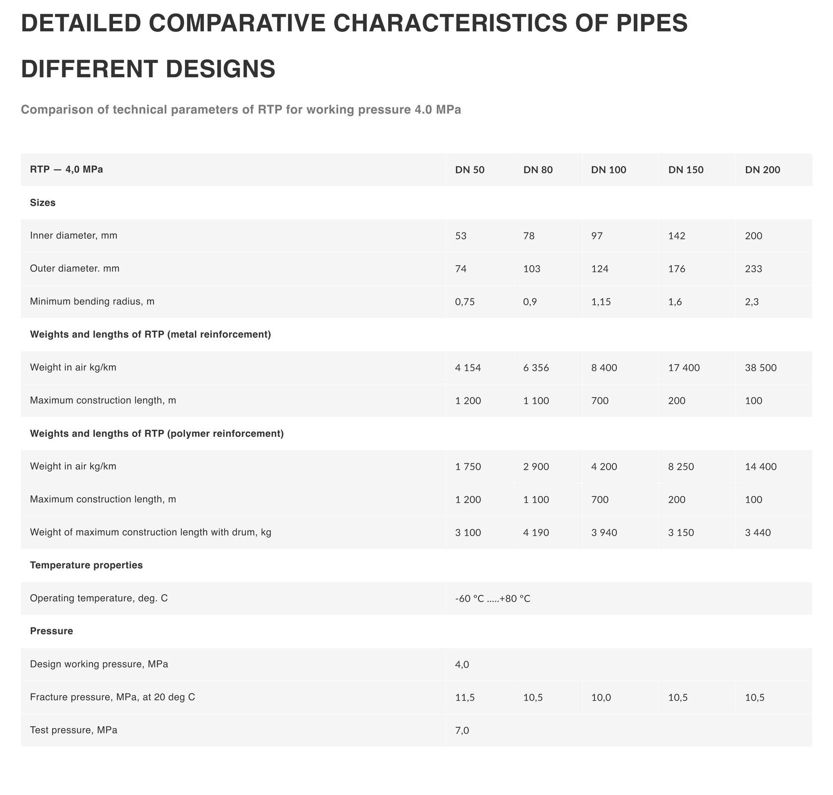 RTP have unquestionable advantages over pipes with reinforcement steel tape reinforced pipes, in particular - significantly lower linear weight and lower cost of materials for similar sizes, better thermal insulation, as well as the absence of potentially corrosion-prone pipe elements. pipe components.